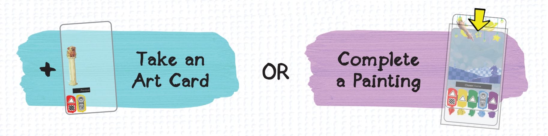 由最近曾經畫畫的玩家擔任起始玩家,順時針方向依序輪流行動,輪到玩家的回合時,玩家可以執行「拿取 1 張藝術卡」或「完成 1 幅畫作」。玩家手中最多只能有 5 張卡片,輪到玩家行動時,如果玩家已經有 5 張卡片,則玩家只能執行「完成 1 幅畫作」。