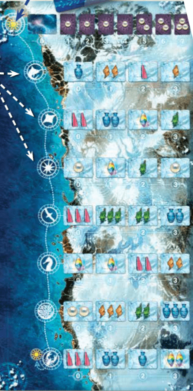 當玩家初次抵達終點龍蝦港(Lobster Port)時,玩家轉換移動方向,依照規則逐步移動回太陽港,此後再次抵達龍蝦港時,玩家直接回到起點太陽港(Sun Port)重新出發。返回太陽港的玩家,可以購買一項珍珠商品,購買的價格及補貨方式與其他港口商品的規則相同。